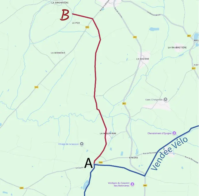 Depuis l’itinéraire Vendée Vélo, allé du Couvent, traverser la route (D89) et prendre la direction La Benancisière puis La Moussière et traverser le hameau.