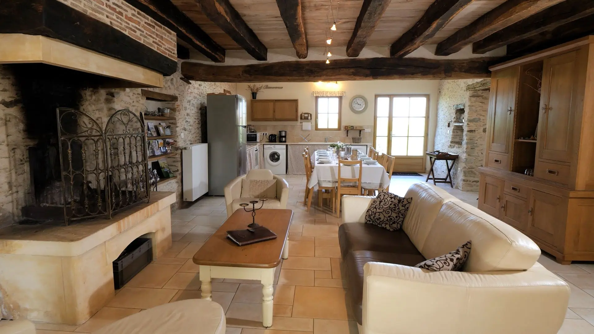 - Pièce de vie de 55 m² comprenant cuisine équipée, séjour, salon et cheminée (foyer ouvert)