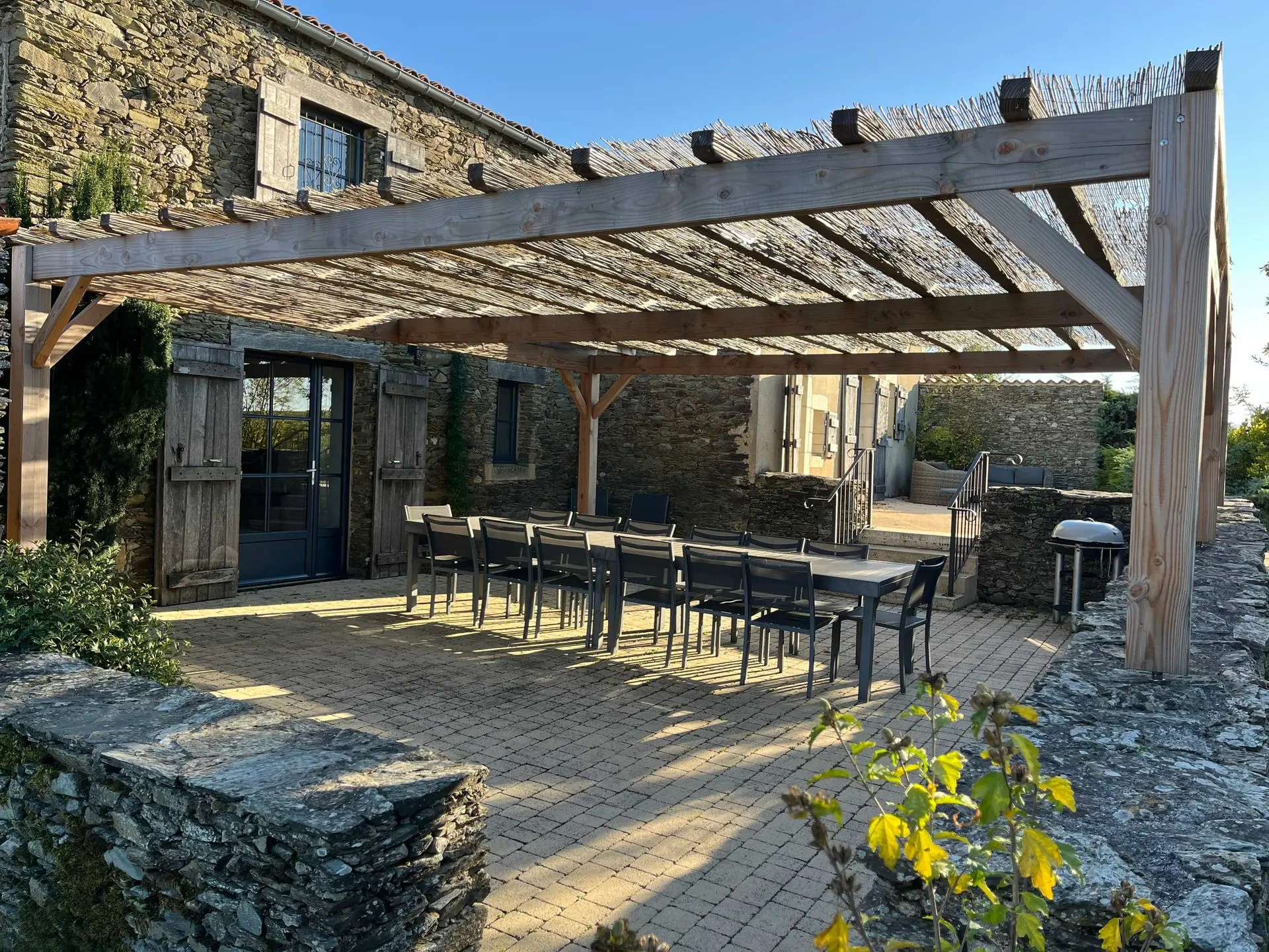 - 1 terrasse couverte avec salon de jardin et 1 terrasse avec pergola en bois, sans vis à vis, équipée de tables, chaises, barbecue