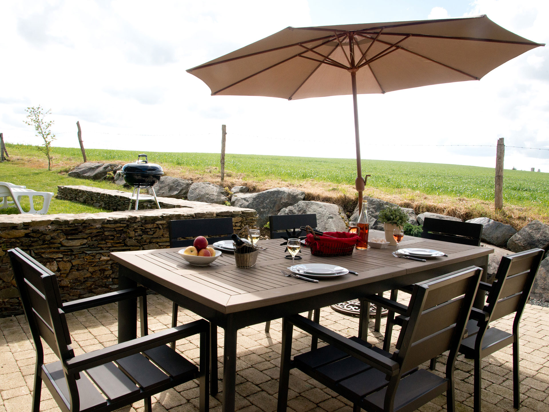 - 1 terrasse avec pergola en bois sans vis à vis équipée de tables, chaises, barbecue